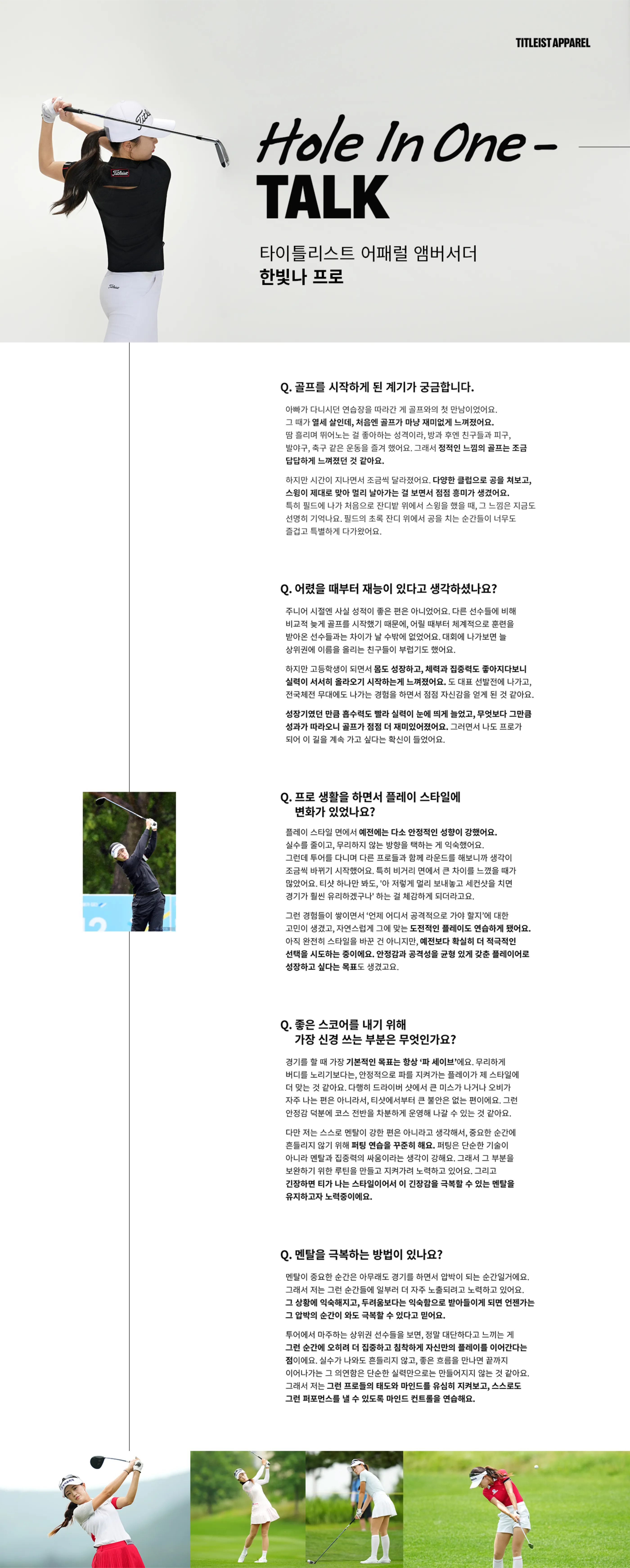 한빛나 선수님~ 첫 정규투어를 잘 보내신 만큼 내년도 더욱 기대하겠습니다! 아마추어가 공감할 수 있을만한 이야기들을 해줘서(늦게 시작한 골프, 밸런스 중요, 옷입는꿀팁 등) 내용도 알차게 매거진 잘 읽었습니다. 내년에도 응원할게요. 화이팅!