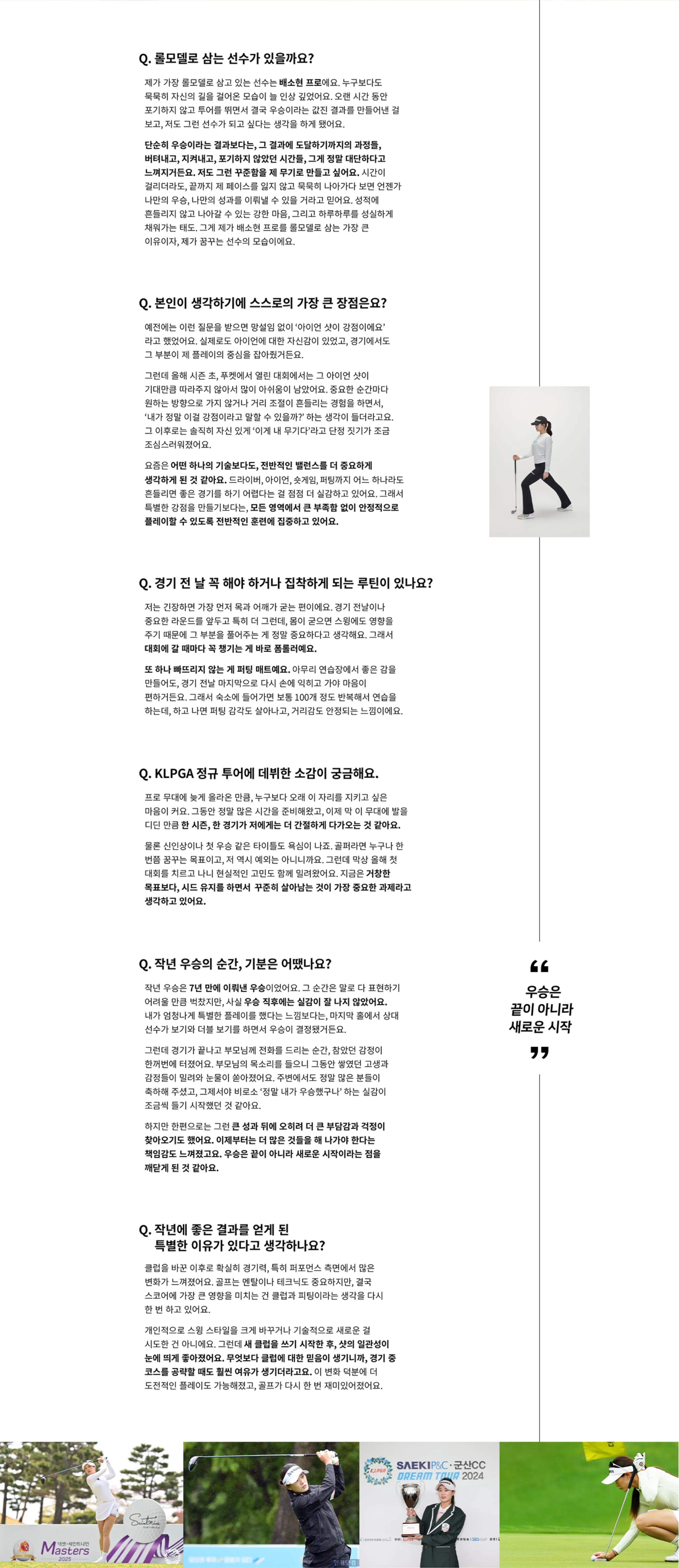 작년 우승은 7년 만에 이뤄낸 우승이었어요. 그 순간은 말로 다 표현하기 어려울 만큼 벅찼지만, 사실 우승 직후에는 실감이 잘 나지 않았어요. 내가 엄청나게 특별한 플레이를 했다는 느낌보다는, 마지막 홀에서 상대 선수가 보기와 더블 보기를 하면서 우승이 결정됐거든요.