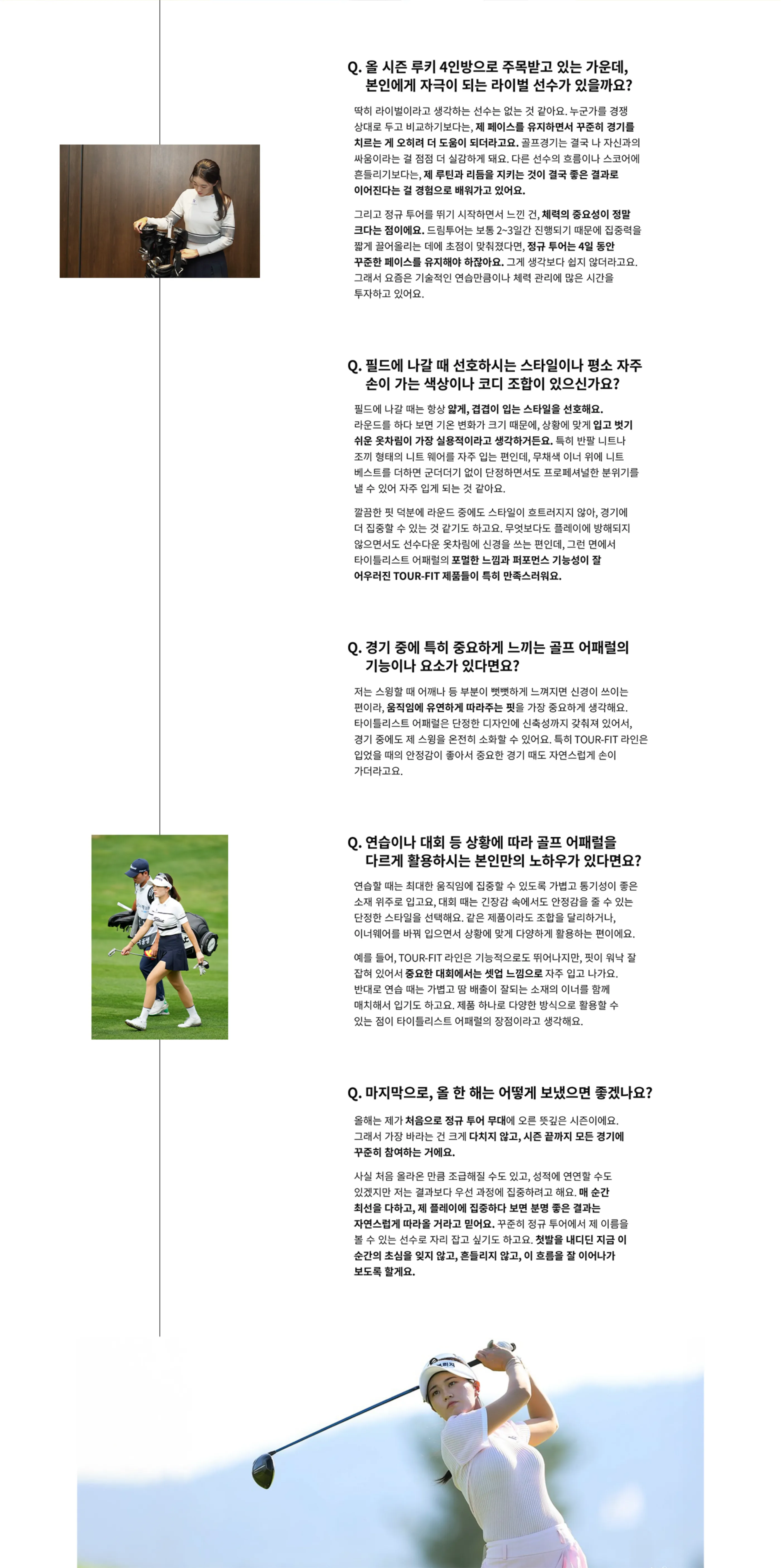 저는 스윙할 때 어깨나 등 부분이 뻣뻣하게 느껴지면 신경이 쓰이는 편이라, 움직임에 유연하게 따라주는 핏을 가장 중요하게 생각해요. 타이틀리스트 어패럴은 단정한 디자인에 신축성까지 갖춰져 있어서, 경기 중에도 제 스윙을 온전히 소화할 수 있어요. 특히 TOUR-FIT 라인은 입었을 때의 안정감이 좋아서 중요한 경기 때도 자연스럽게 손이 가더라고요.