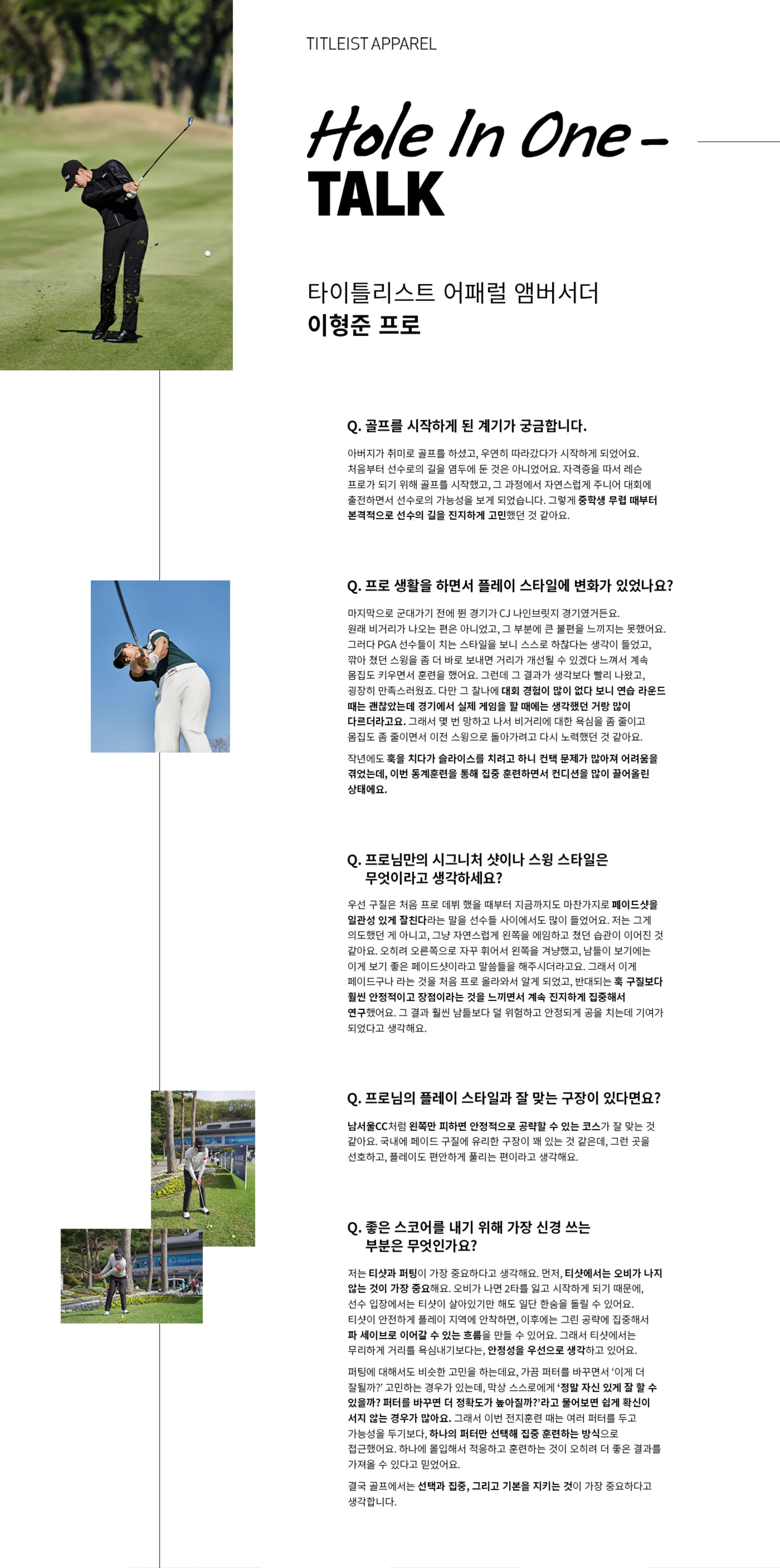 우선 구질은 처음 프로 데뷔 했을 때부터 지금까지도 마찬가지로 페이드샷을 일관성 있게 잘친다라는 말을 선수들 사이에서도 많이 들었어요. 저는 그게 의도했던 게 아니고, 그냥 자연스럽게 왼쪽을 에임하고 쳤던 습관이 이어진 것 같아요. 오히려 오른쪽으로 자꾸 휘어서 왼쪽을 겨냥했고, 남들이 보기에는 이게 보기 좋은 페이드샷이라고 말씀들을 해주시더라고요. 그래서 이게 페이드구나 라는 것을 처음 프로 올라와서 알게 되었고, 반대되는 훅 구질보다 훨씬 안정적이고 장점이라는 것을 느끼면서 계속 진지하게 집중해서 연구했어요. 그 결과 훨씬 남들보다 덜 위험하고 안정되게 공을 치는데 기여가 되었다고 생각해요.