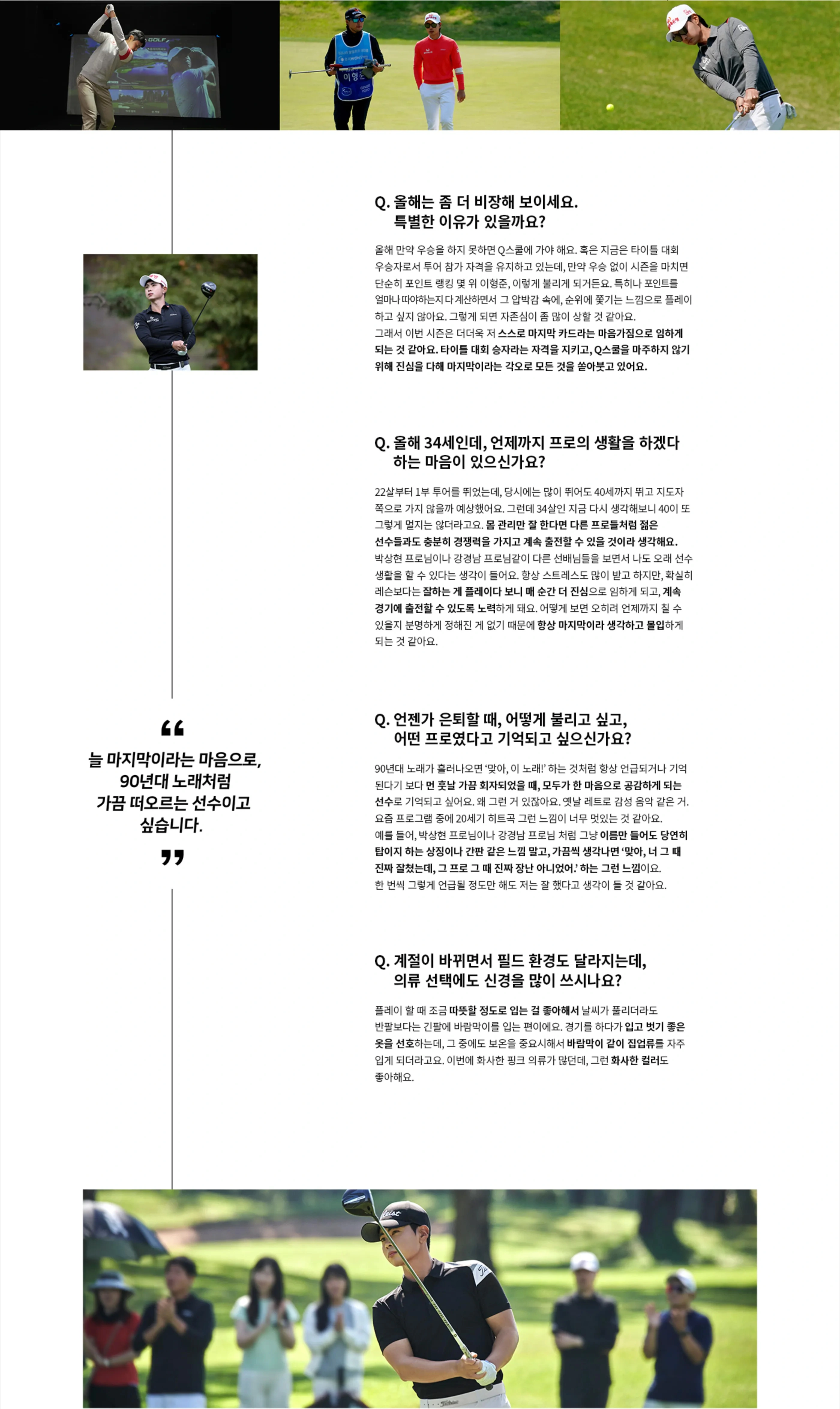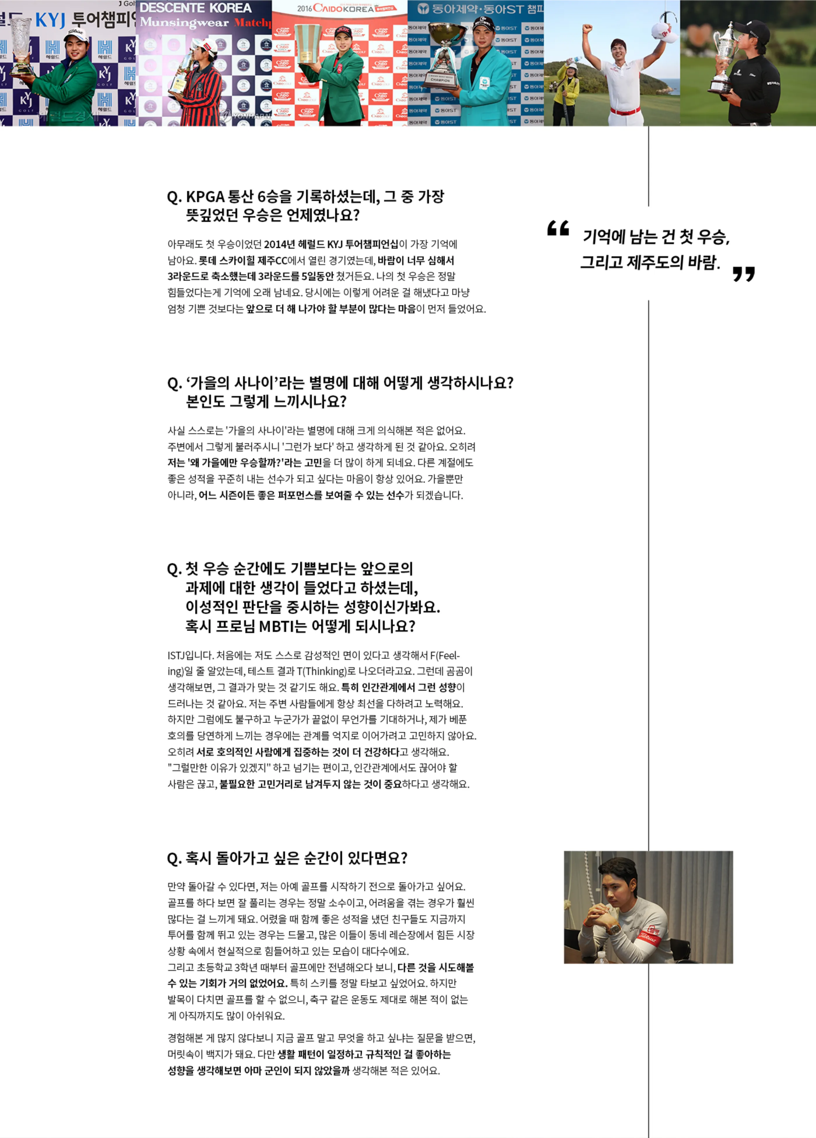 사실 스스로는 ‘가을의 사나이’라는 별명에 대해 크게 의식해본 적은 없어요. 주변에서 그렇게 불러주시니 ‘그런가 보다’ 하고 생각하게 된 것 같아요. 오히려 저는 ‘왜 가을에만 우승할까?’라는 고민을 더 많이 하게 되네요. 다른 계절에도 좋은 성적을 꾸준히 내는 선수가 되고 싶다는 마음이 항상 있어요. 가을뿐만 아니라, 어느 시즌이든 좋은 퍼포먼스를 보여줄 수 있는 선수가 되겠습니다.